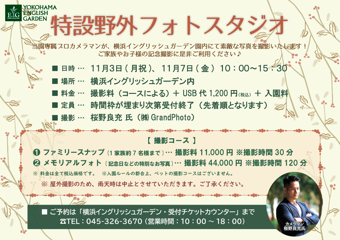 当園専属のプロカメラマンが、秋の横浜イングリッシュガーデン園内にて素敵な記念写真を撮影する野外フォトスタジオを開催いたします!ご家族の集合写真やお子様の記念写真など、是非ご利用ください♪