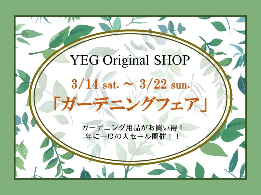 3/14(土)~3/22(日)の期間中、当園併設ショップ「YEG Original SHOP」にて、年に一度の大セール・春のガーデニングフェアを開催!