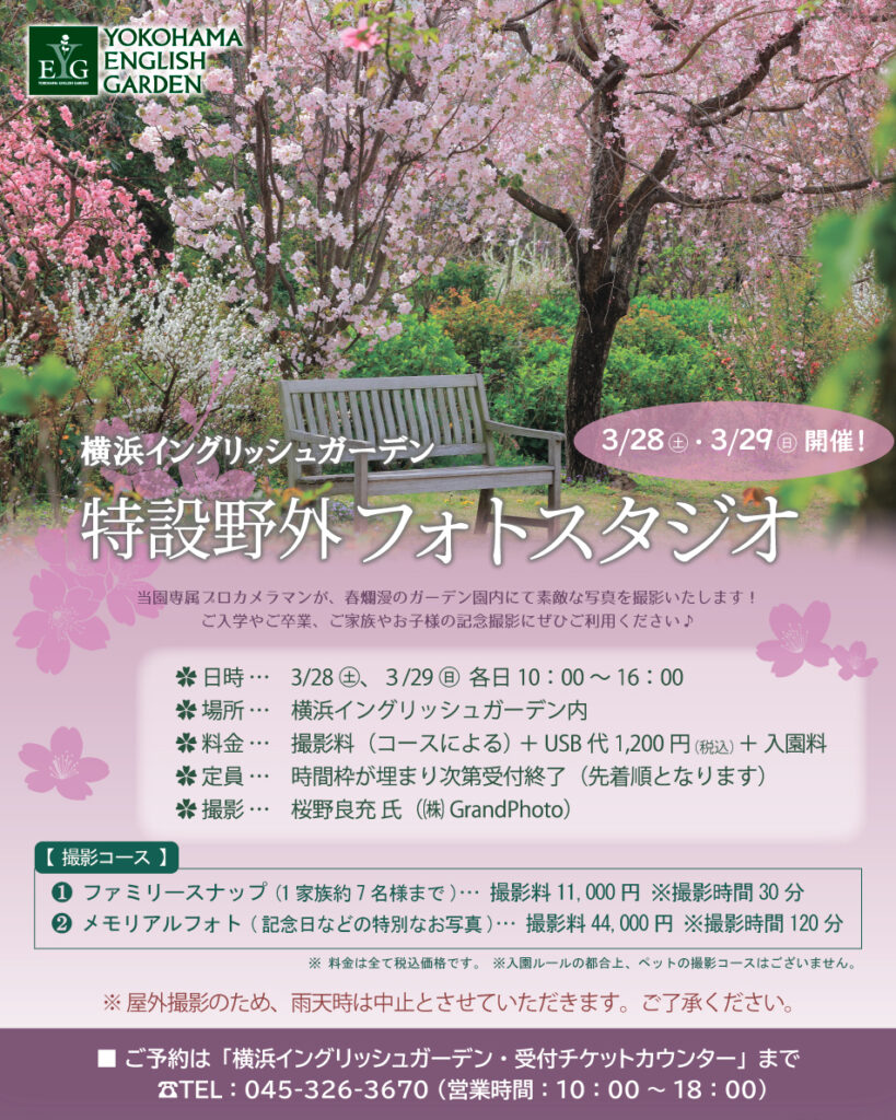 プロカメラマンが横浜イングリッシュガーデン園内にて記念写真の撮影を行う「特設野外フォトスタジオ」を開催致します!春のガーデンで、ご家族のお写真や記念日のお写真、お子様のご入学・ご卒業を記念してのお写真など、思い出に残るお写真を撮影しませんか?※屋外撮影の為、雨天時は中止とさせて頂きますのでご了承下さい。