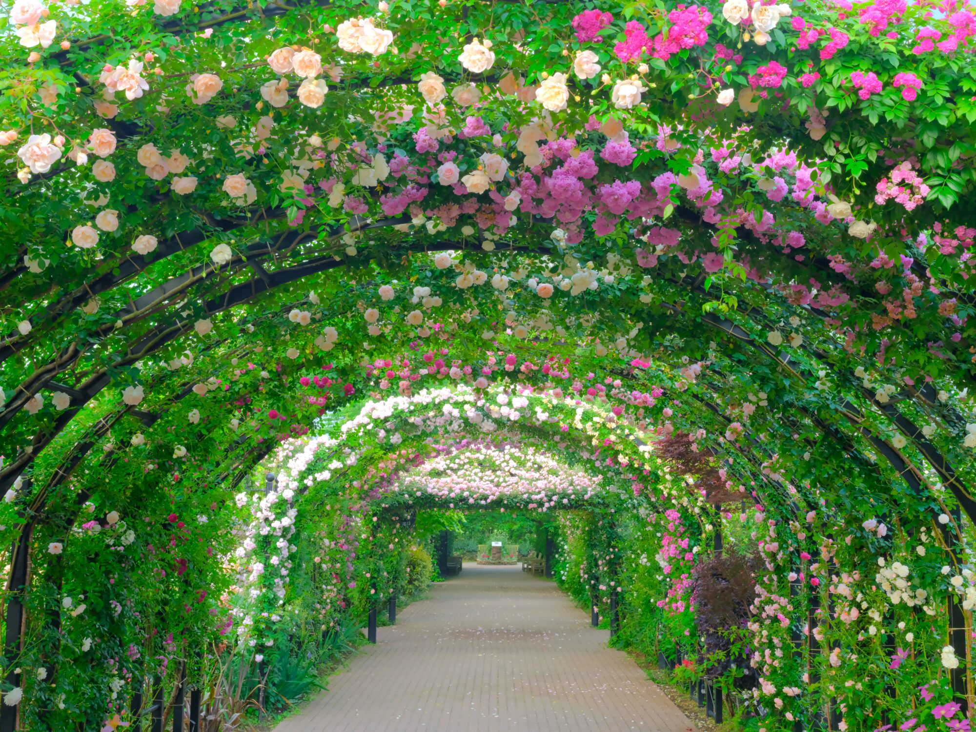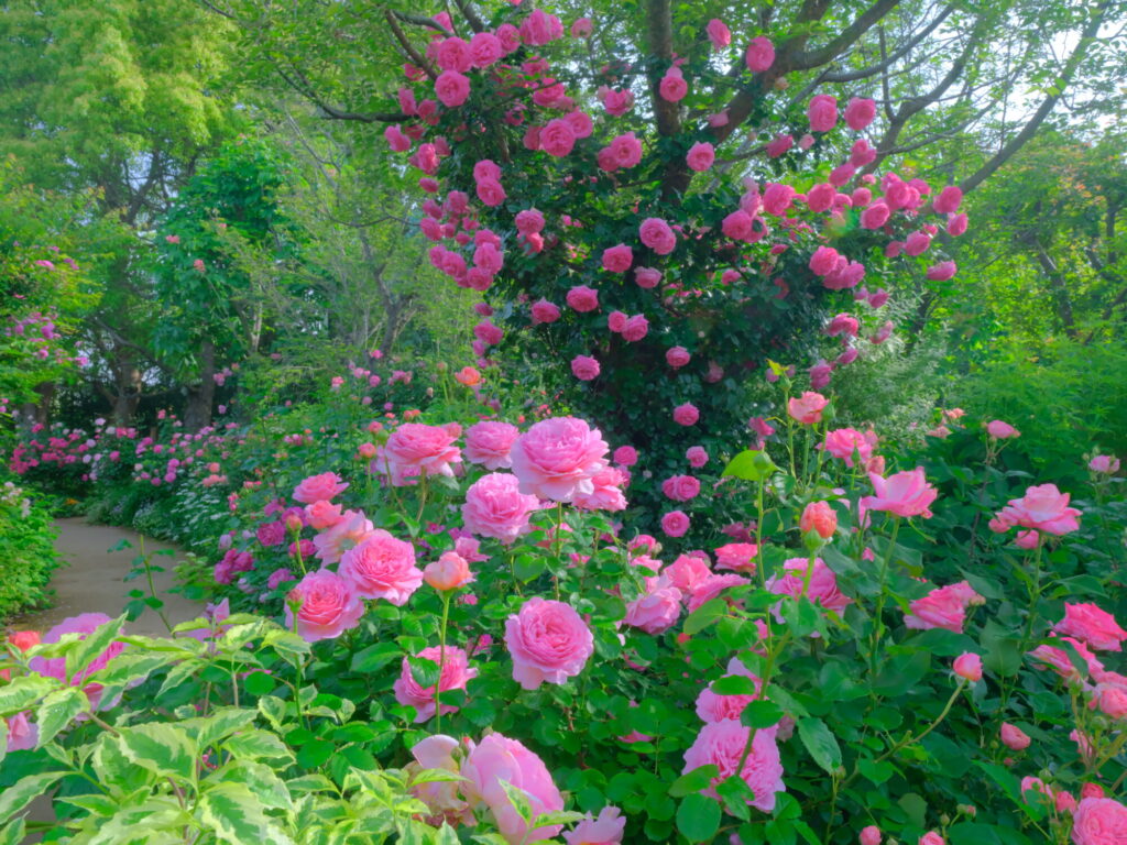 例年5月中旬頃には、当園の入口からおよそ50mにおよびつるバラを這わせた大型アーチが連なる「ローズ・トンネル」も見頃を迎えます。一年でこの時期にしか見られない、一面バラに囲まれる圧巻の風景を是非ご覧ください。