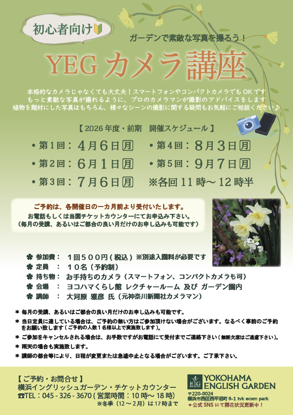 カメラ初心者の方でも素敵な写真が撮れるよう、講師が撮影のアドバイスをするカメラ講座のご案内です。どなたさまも是非お気軽にご参加ください。